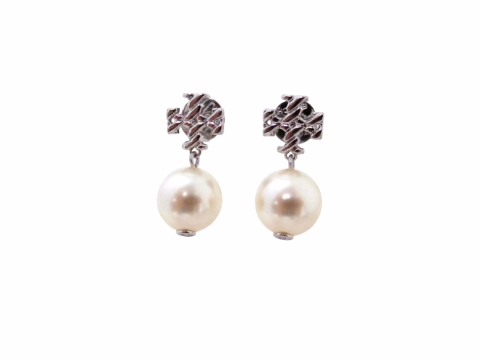 Tory Burch Rope Logo Pearl Drop Earrings Silver