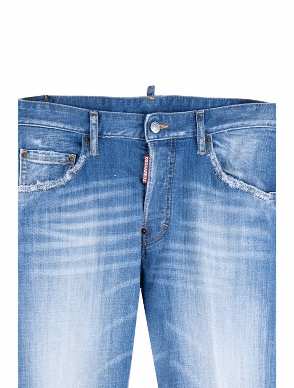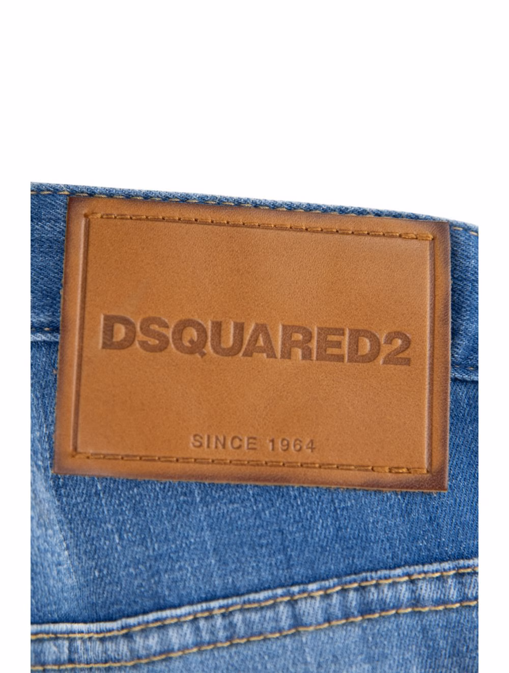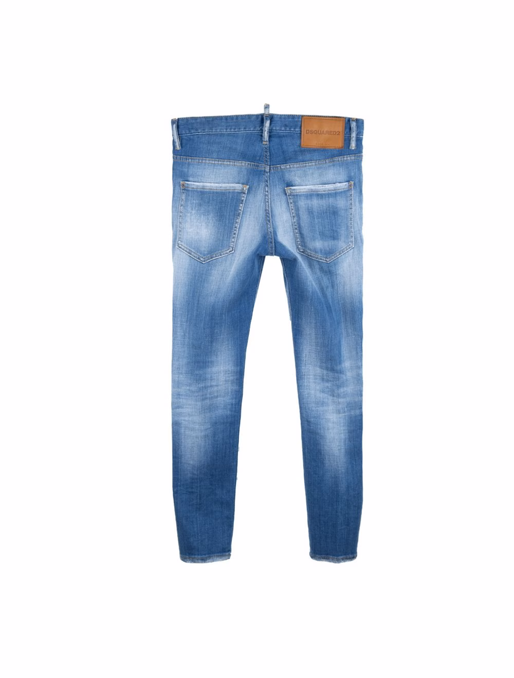 Men’s jeans by Dsquared2. Fabric made 98% cotton and 2% elastane. Pocket lining made of 65% polyester and 35% cotton. Jeans feature side pockets on the front, one of them characterized by mini envelope pocket. Back envelope pockets. Some parts of the outer surface characterized by used/tear style details. Features on the back sewn logo patch at waist height, made of leather. Button closure, embellished with stitched logo patch.