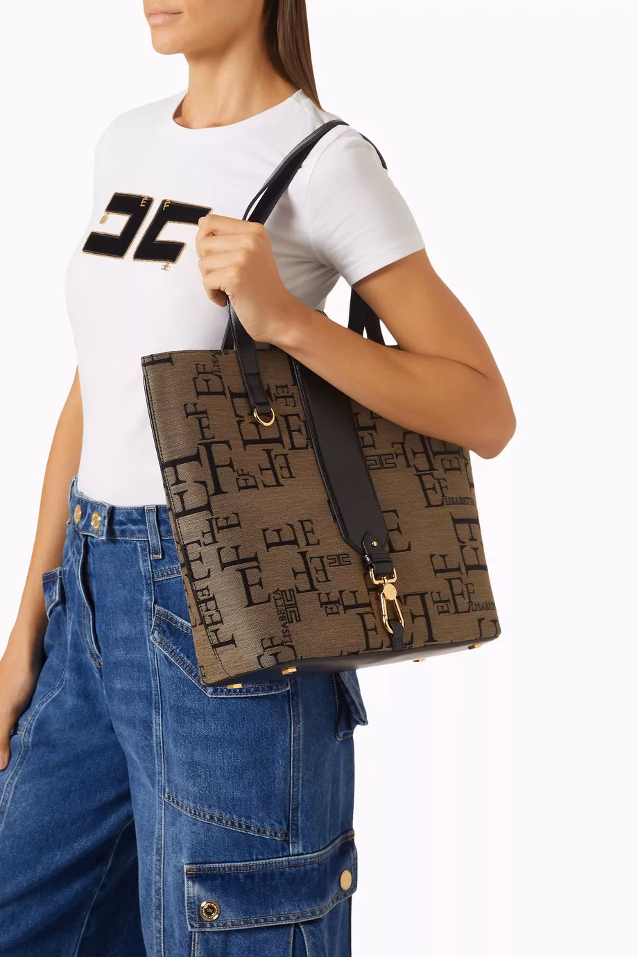 The Elisabetta Franchi Maxi Tote is not just any ordinary bag, it’s a masterpiece crafted with the new iconic pattern that the Maison is renowned for. The initials of the brand are interwoven in a stunning motif to create an unparalleled bag collection