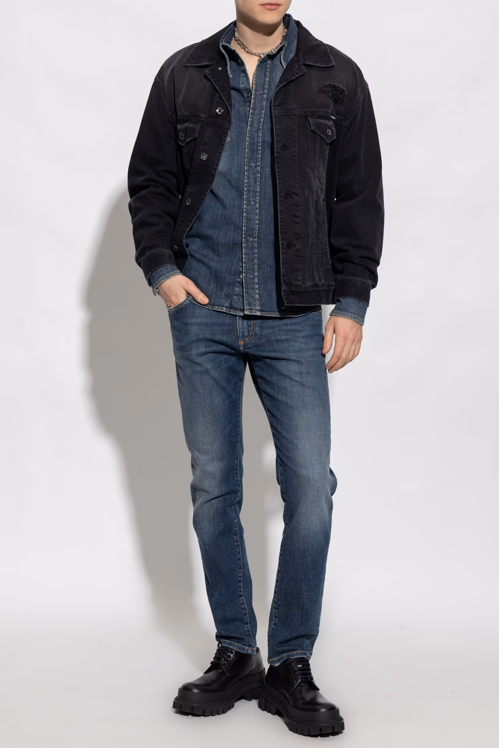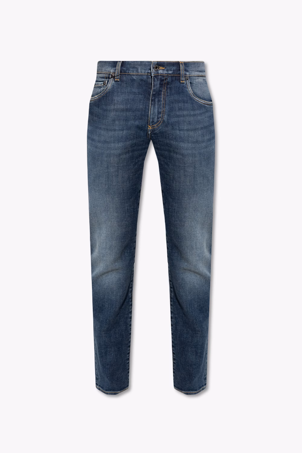 Navy blue jeans from Dolce & Gabbana. Crafted from cotton with distressed effects, this pair falls with tapered legs and features a zip fly with a button, classic five pockets and a logo-engraved patch at the back.