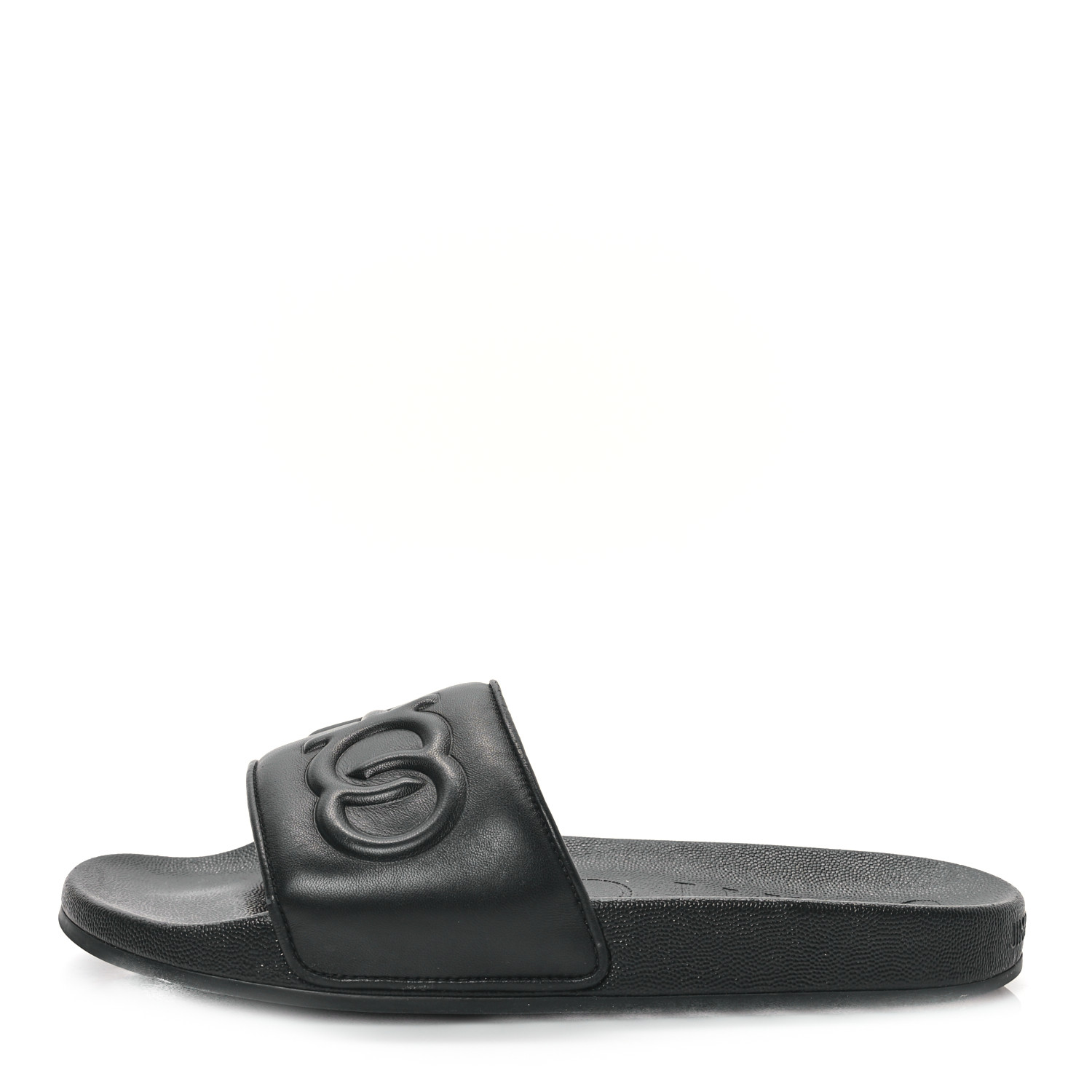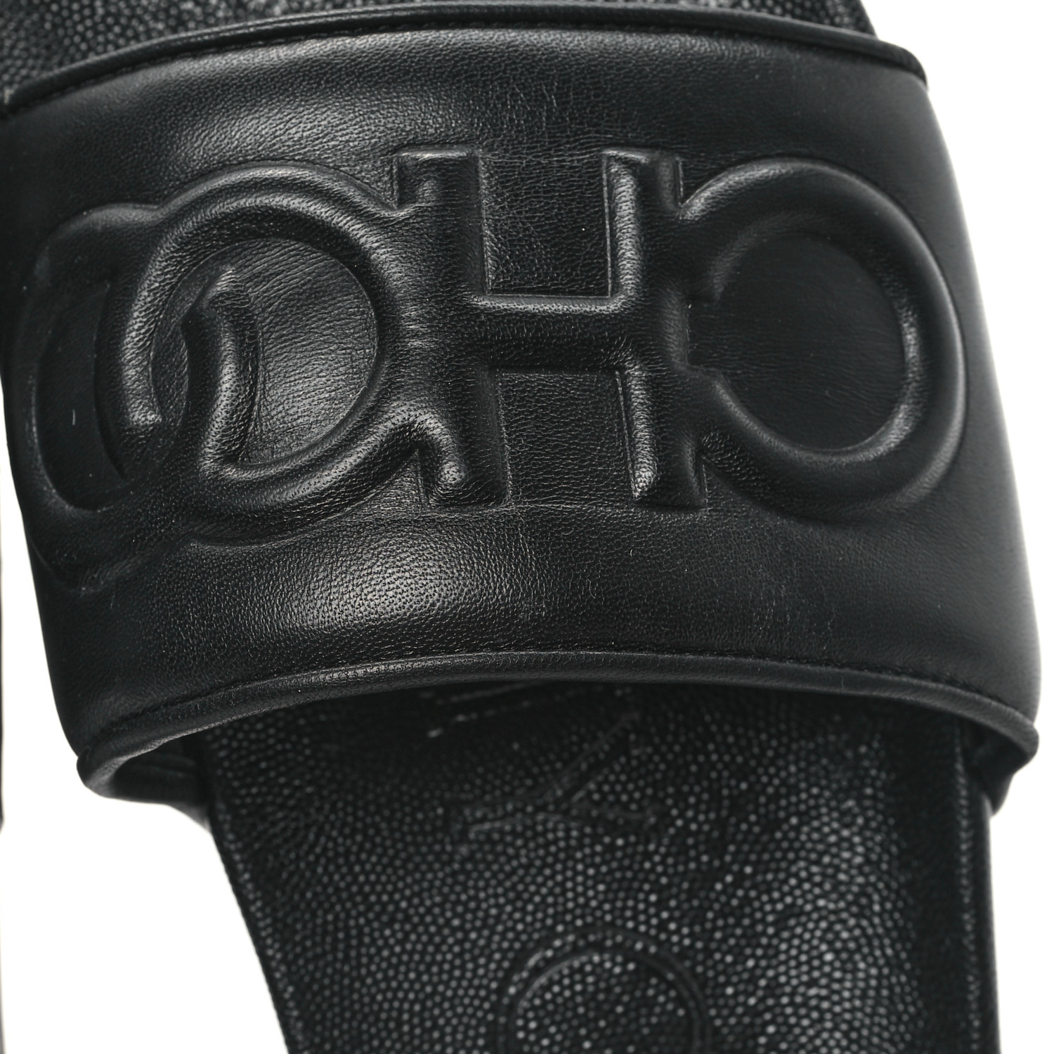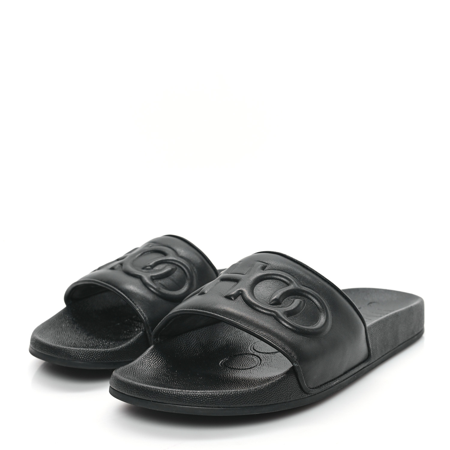 These are authentic JIMMY CHOO Nappa Embossed Logo Azari Slide Sandals size 40 in Black. These stylish slide sandals feature black crossover straps with ‘Choo’ embossed on the top and black rubber soles.
