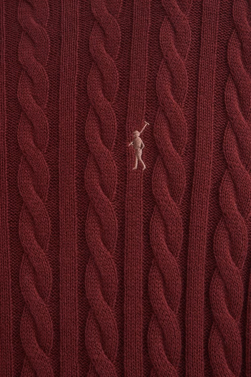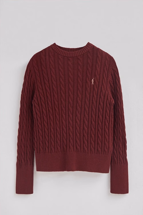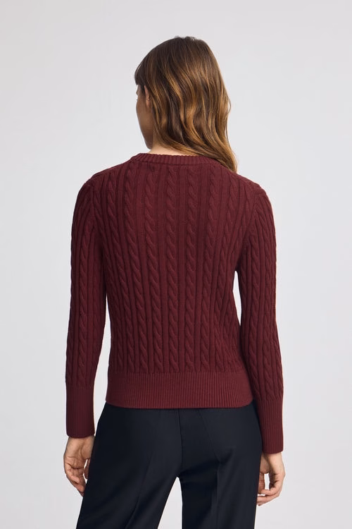 Women’s long-sleeve jumper with regular fit and round neck. Made of a wool and cotton blend with a cable-knit design. A timeless and comfy piece.