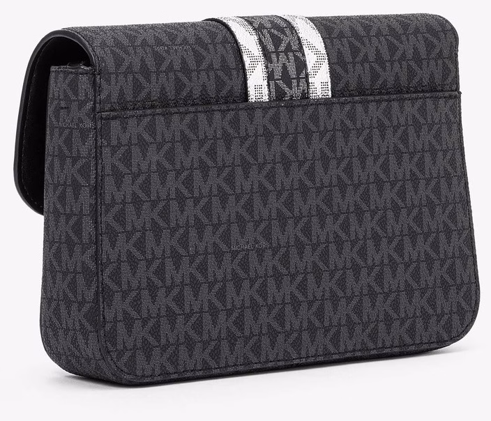 The handbag shown is the Michael Kors Sloan Editor Flap Messenger Bag. The bag features the brand’s signature logo-print canvas with a center stripe and comes with a woven logo tape shoulder strap.