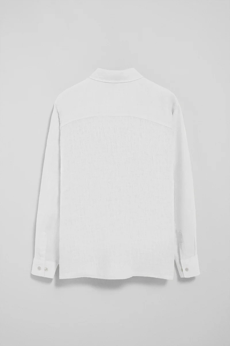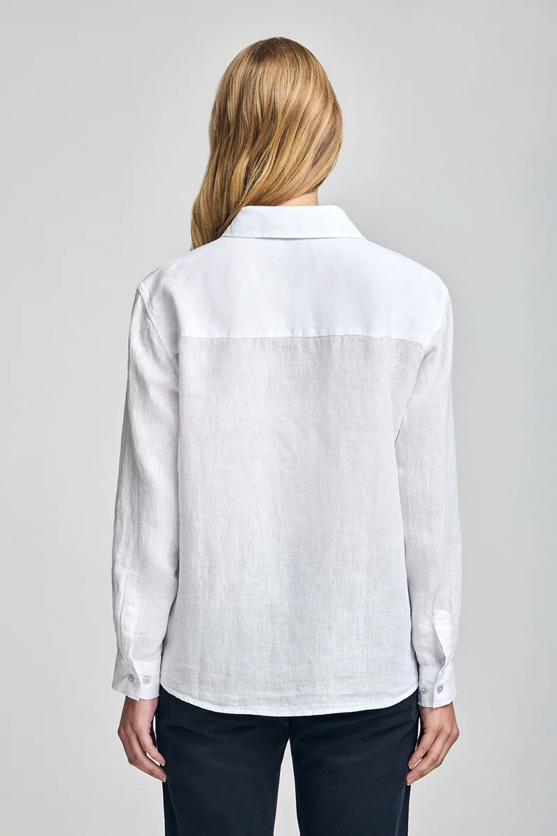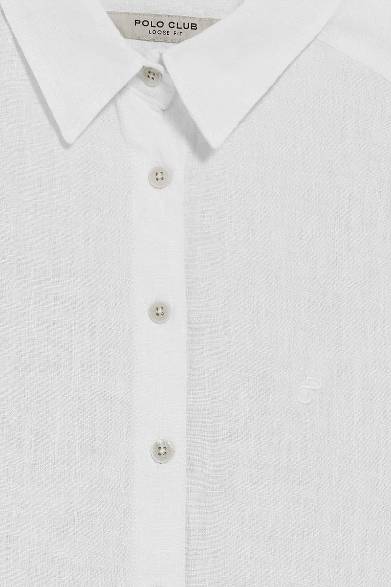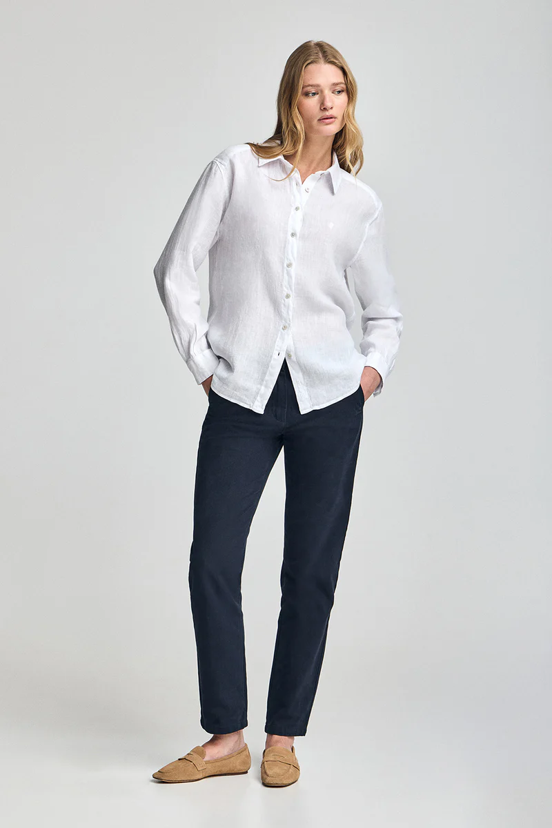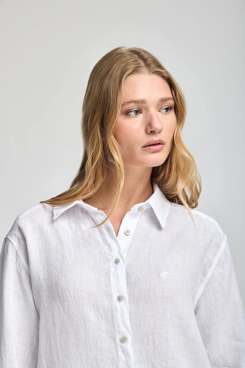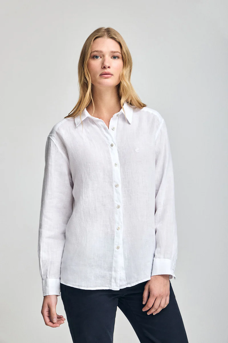 This women’s linen shirt with a garment-dye finish combines comfort and sophistication. Its loose fit and shirt collar provide a casual look, while the pearlescent logo buttons and tonal piping inside the collar add a distinctive touch. The embroidered PC monogram on the chest and placket complete this timeless and elegant design.
