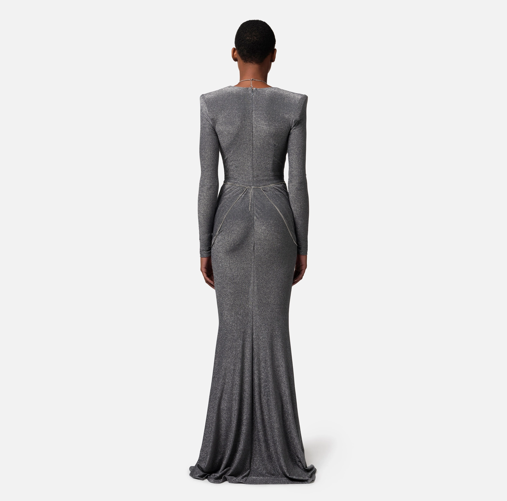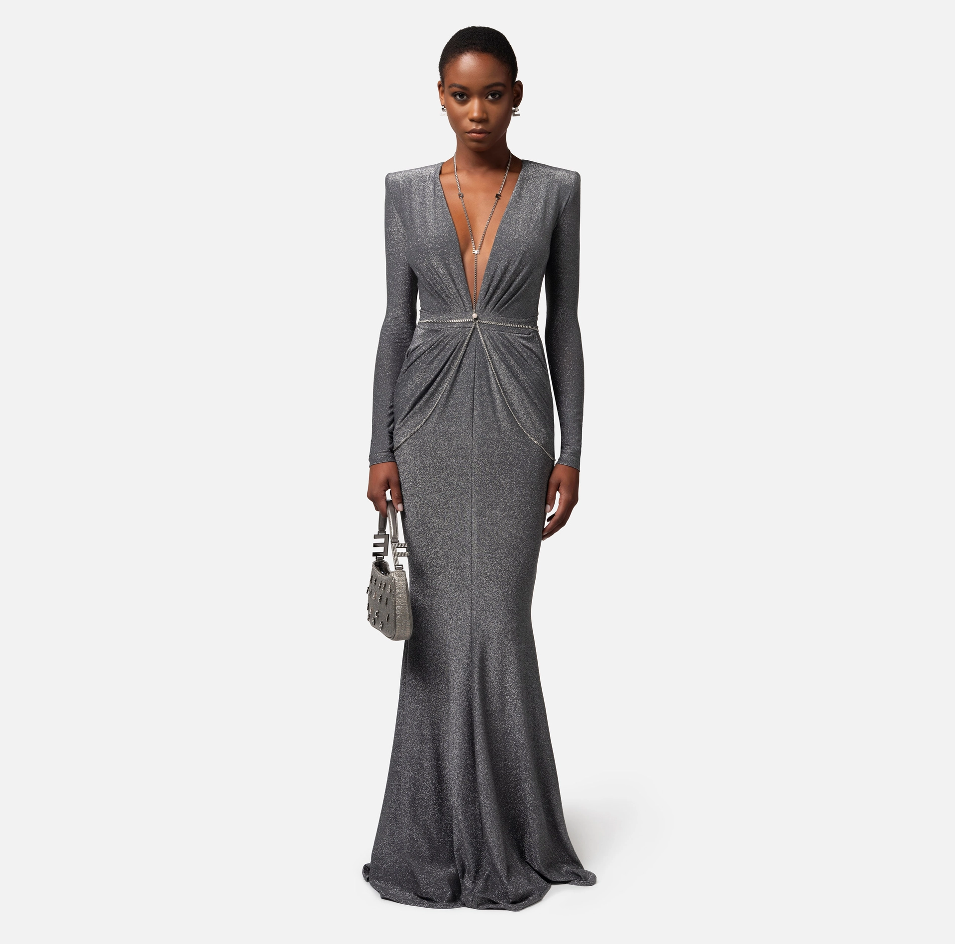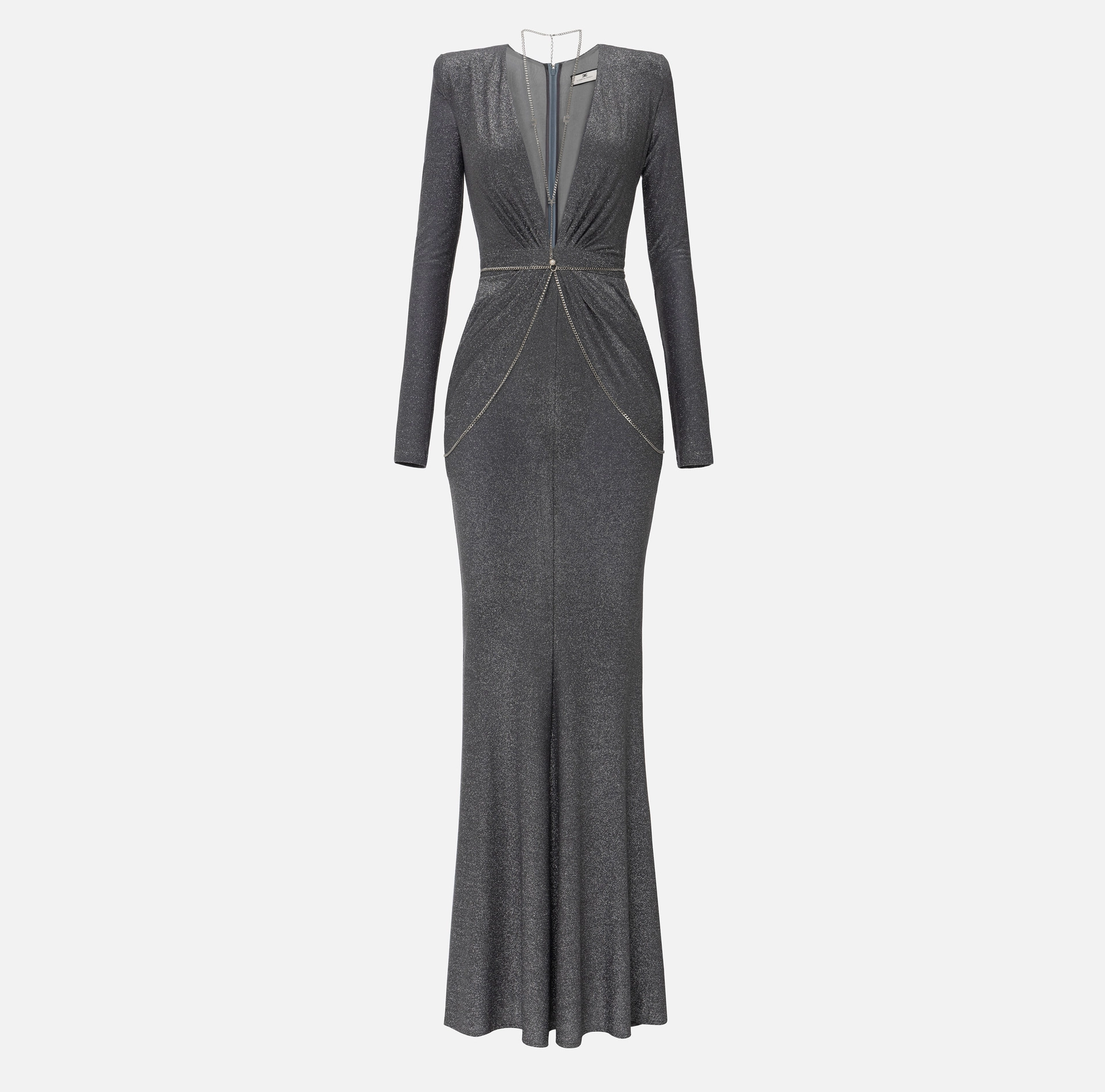 Red Carpet dress in lurex jersey with a plunging neckline and draped skirt over the hips ending in a mermaid line. It features a body chain accessory with golden metal charms that decorates the neckline and closes at the waistline.