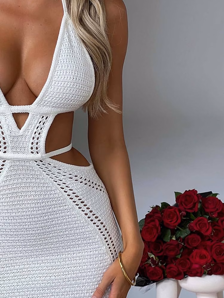 is a crochet knit dress known for its backless design, halter neckline, and figure-hugging fit.