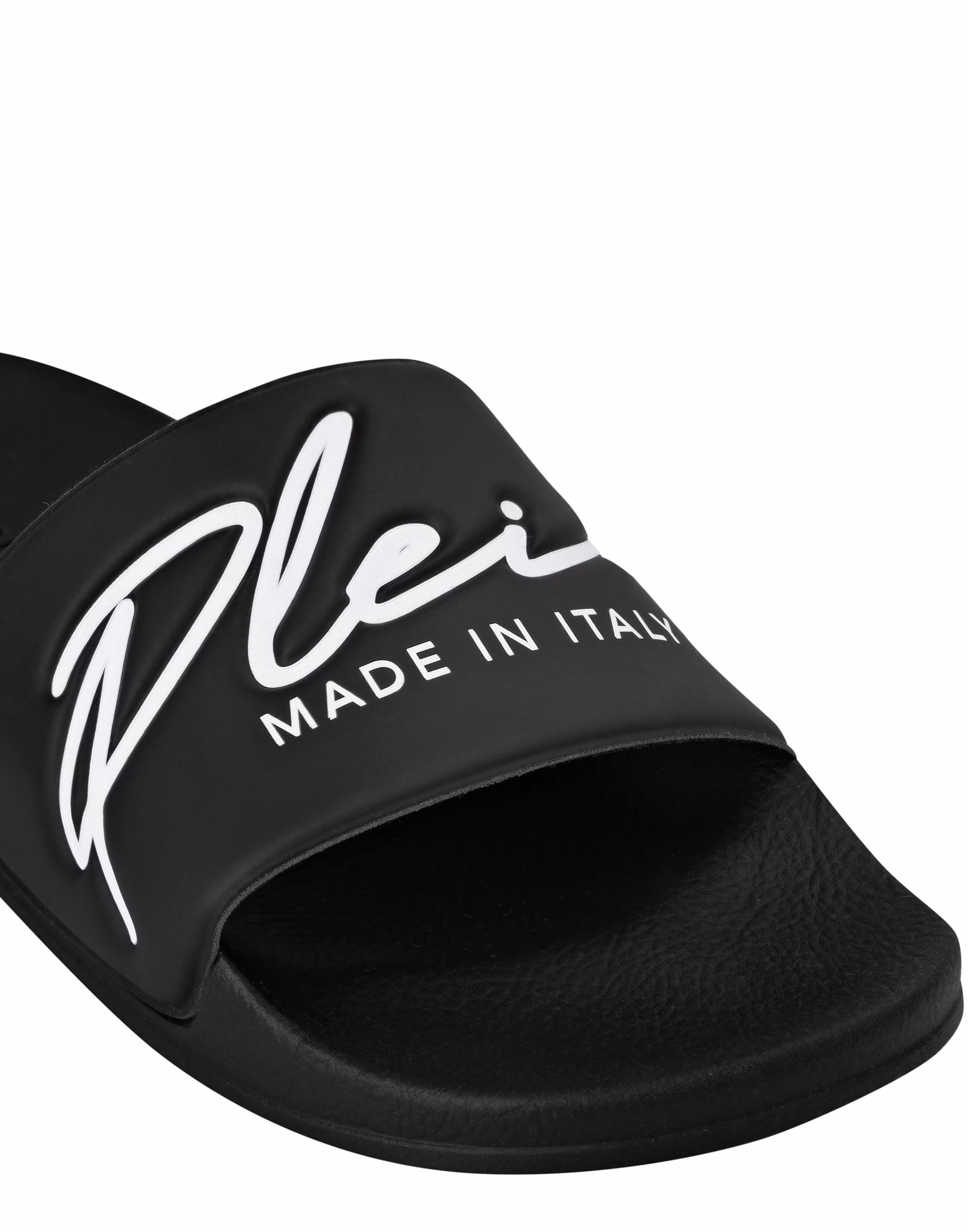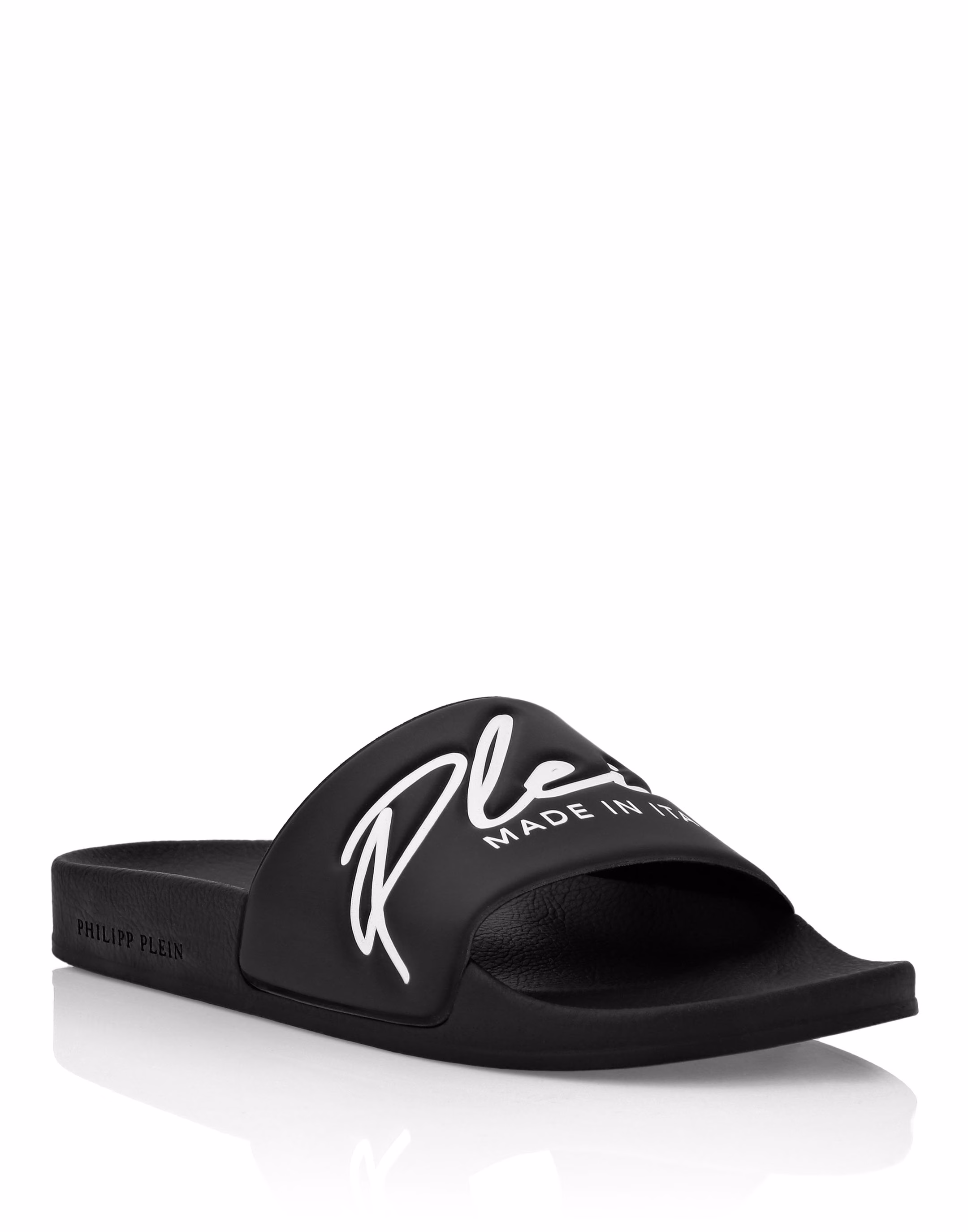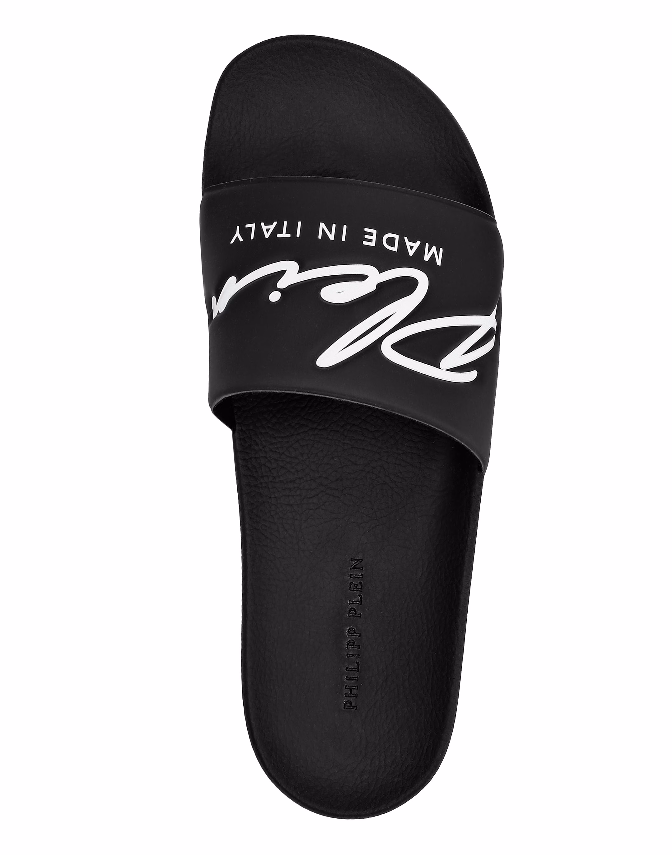 Papuçe gome me logon e markës në rrip. Shtrojë ergonomike për rehati më të madhe dhe taban gome kundër rrëshqitjes.